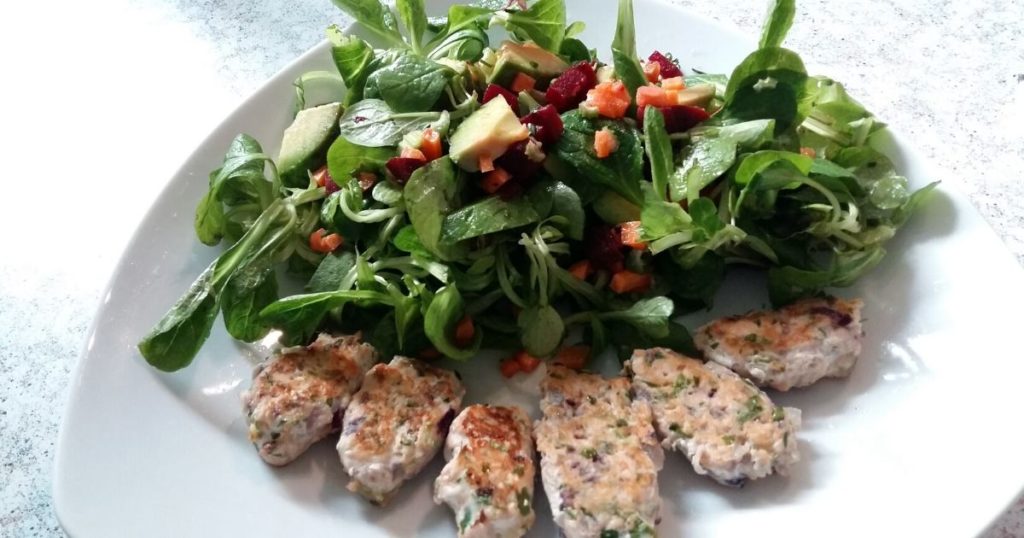 Fischlaibchen mit Blattsalat und Avocado