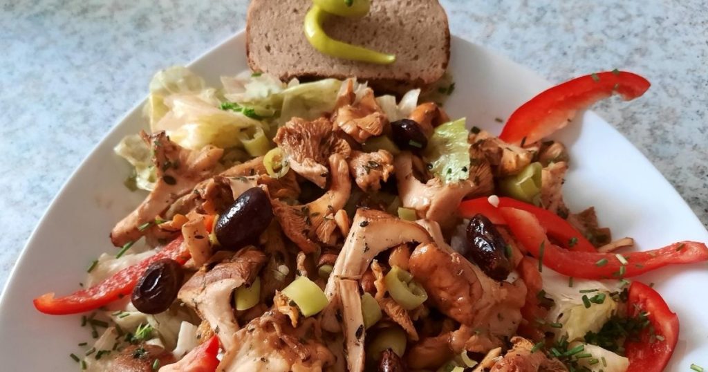 Herbstlicher Blattsalat mit Käferbohnen und marinierten Eierschwammerln/ Pfifferlingen
