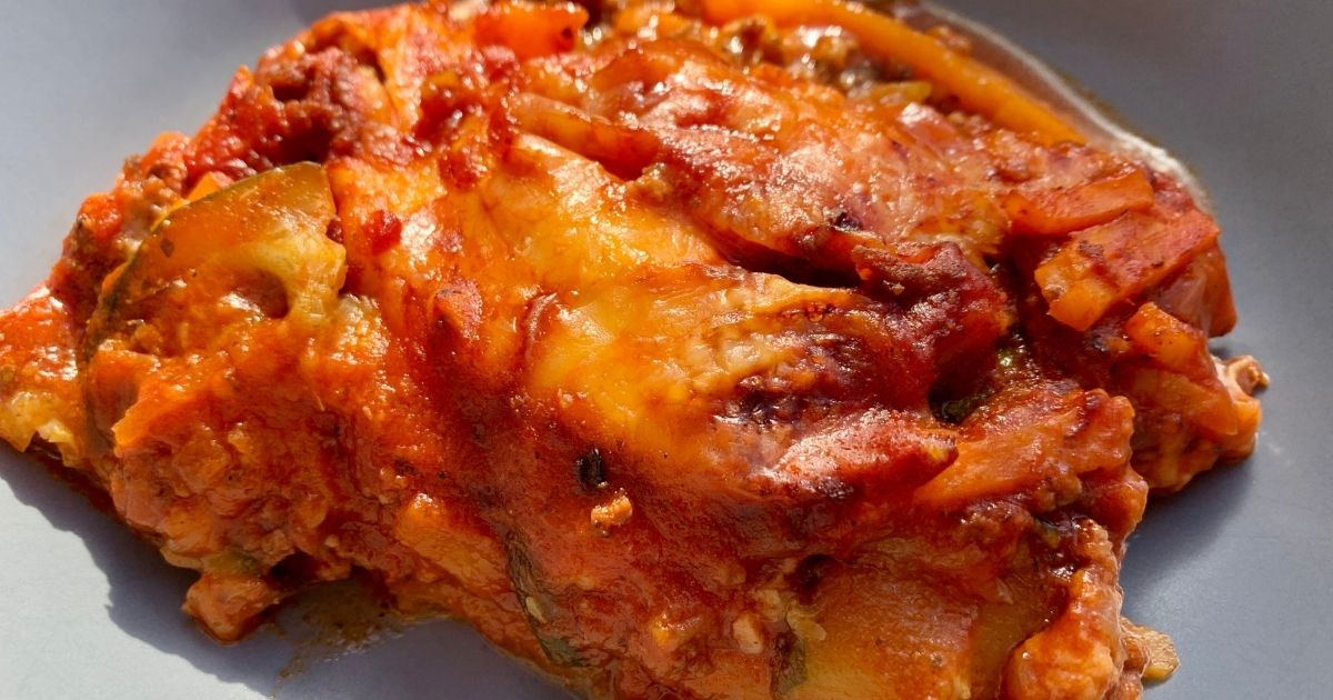 • Zuerst ein wenig von der Tomaten-Fleischsauce in einer Auflaufform verteilen, darauf eine Schicht Süßkartoffelscheiben und eine Schicht Zucchinischeiben legen, mit Salz würzen. Vorgang wiederholen. Als letzte Schicht sollte die Tomaten-Fleischsauce sein. Die Bechamelsauce darauf verteilen und den geriebenen Käse darüber streuen.