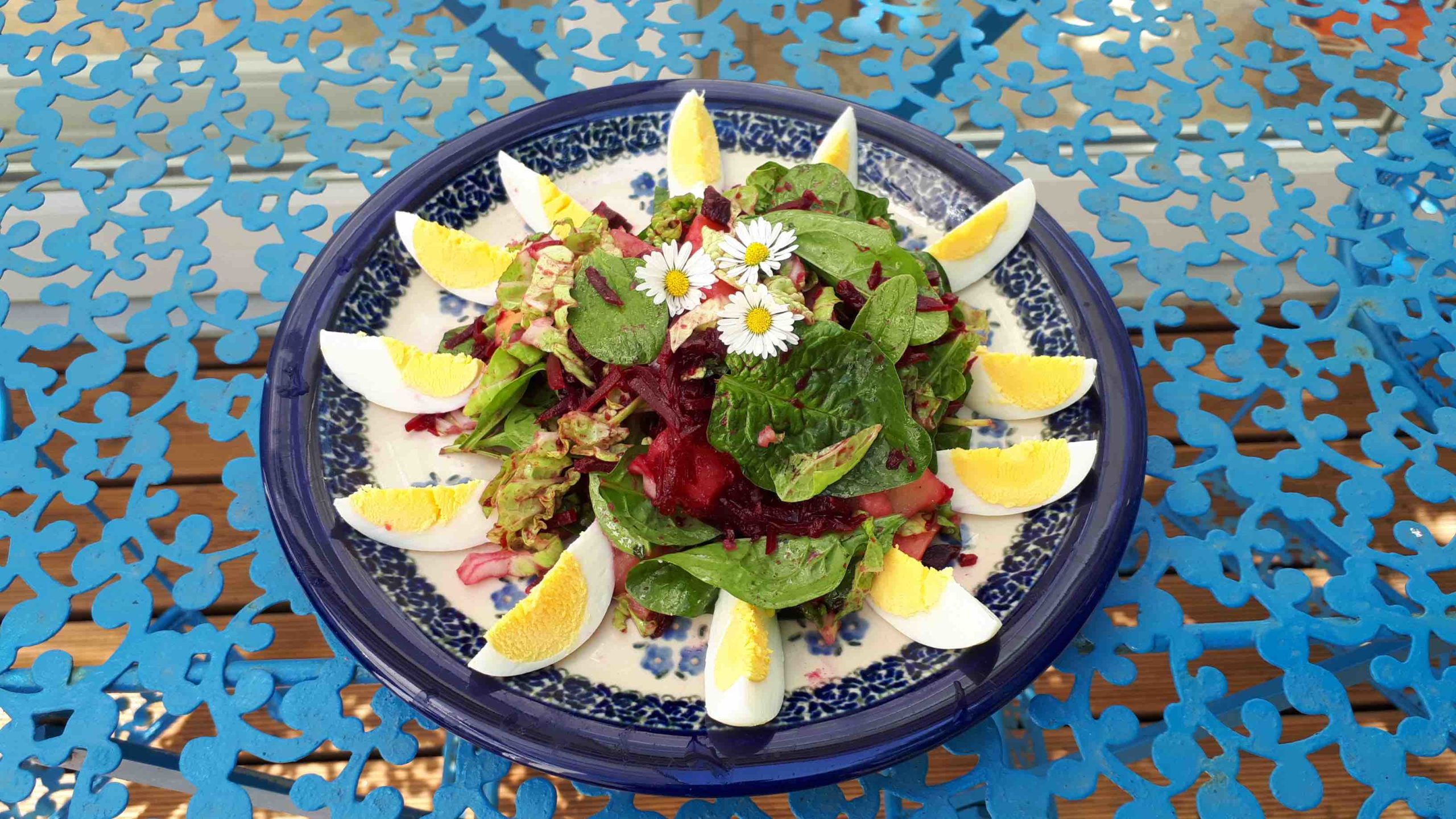 - Das halbe Dressing in eine Schüssel geben und die Spinatblätter damit vermischen und auf einem Teller anrichten. Das restliche Dressing in die Schüssel geben, das Gemüse kurz darin schwenken und auf dem Spinat verteilen. Die Ei-Viertel auf den Salaten verteilen.