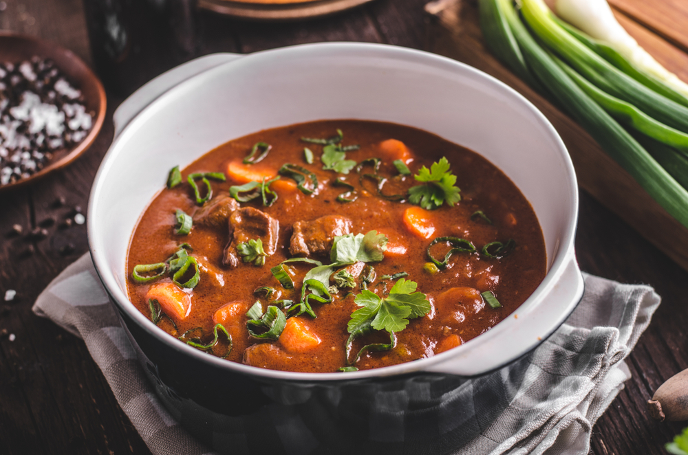 - In derselben Pfanne Zwiebel glasig rösten, dann Karotten und Sellerie hinzugeben und einige Minuten unter rühren braten. Mit Paprikapulver bestäuben, kurz durchrühren, dann mit Fond aufgießen. Kräuter und Fleisch dazugeben und ein paar Minuten köcheln lassen. Maisstärke in ein wenig kaltem Wasser einrühren und dazugeben. Umrühren und aufkochen lassen. Mit Salz und Pfeffer abschmecken und zu den Nudeln servieren.