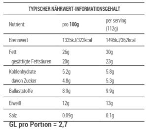 Ohne: Ohne Dinkel, Ohne Ei, Ohne Erdnüsse, Ohne Fisch, Ohne Gluten, Ohne Hefe, Ohne Kerne, Ohne Krebstiere, Ohne Nüsse (Schalenfrüchte), Ohne Roggen, Ohne Schafmilch, Ohne Schwefeldioxid/Sulfite, Ohne Sellerie, Ohne Senf, Ohne Sesam, Ohne Soja, Ohne Weichtiere, Ohne Weizen, Ohne Ziegenmilch