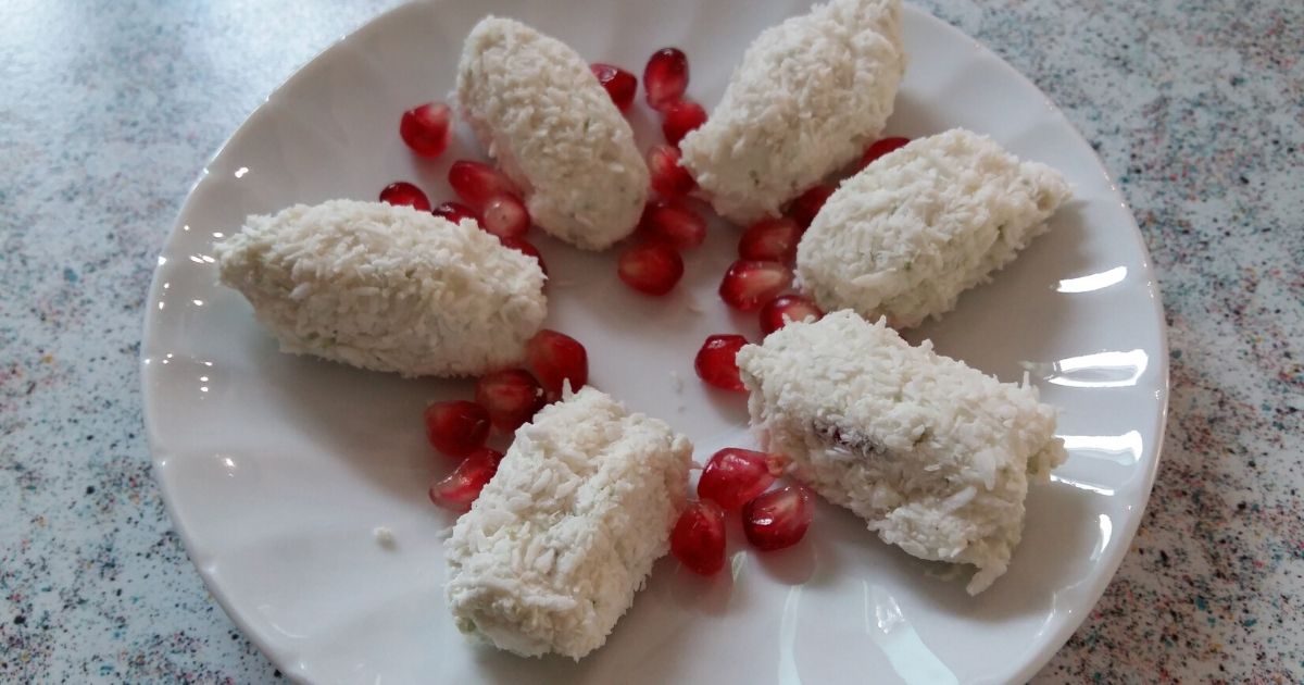 - Mit einem nassen Teelöffel aus dem Topfen/Quark kleine Häufchen stechen und auf den Teller mit den Kokosflocken legen.