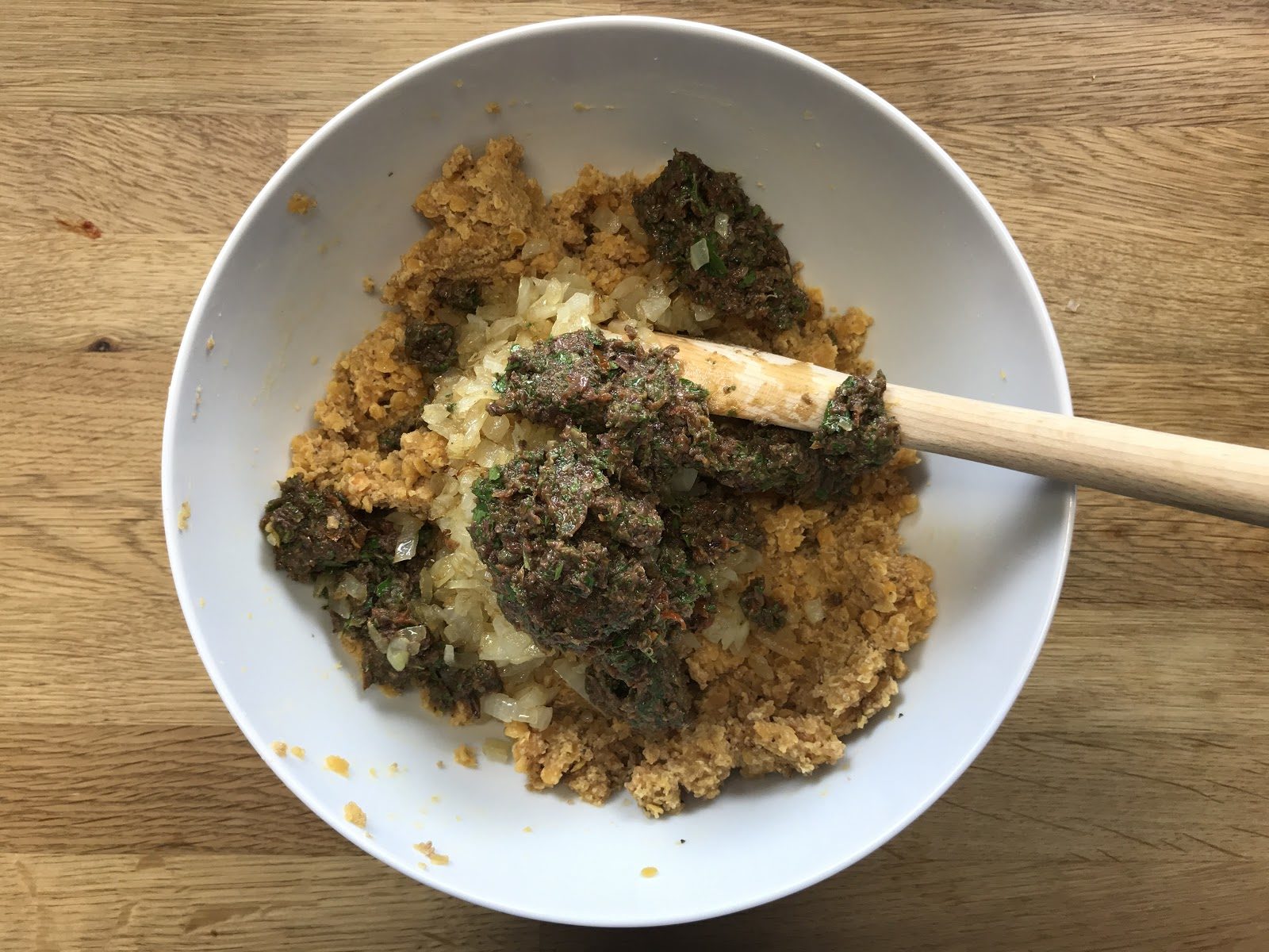 Nach 30 Minuten die Zwiebel und die Tomaten-Oliven-Kapern-Kräuter-Mischung zur Linsen-Couscous-Mischung geben: