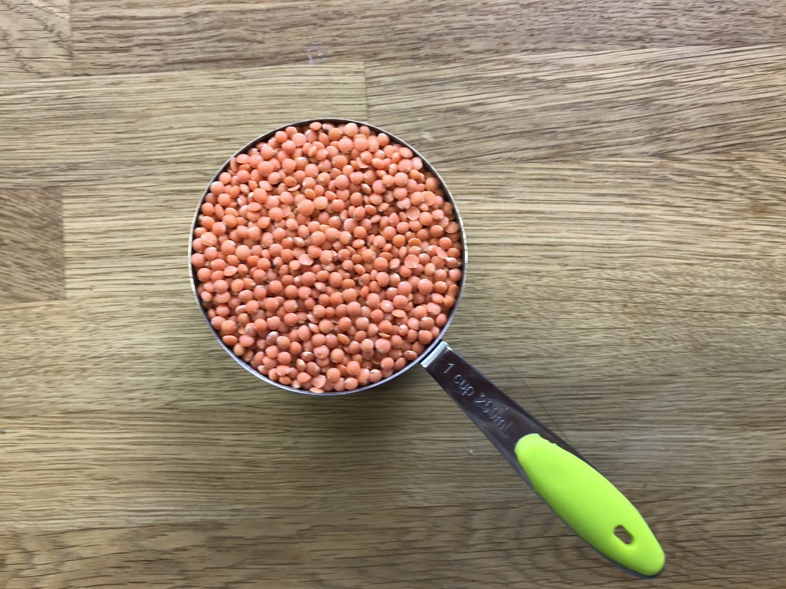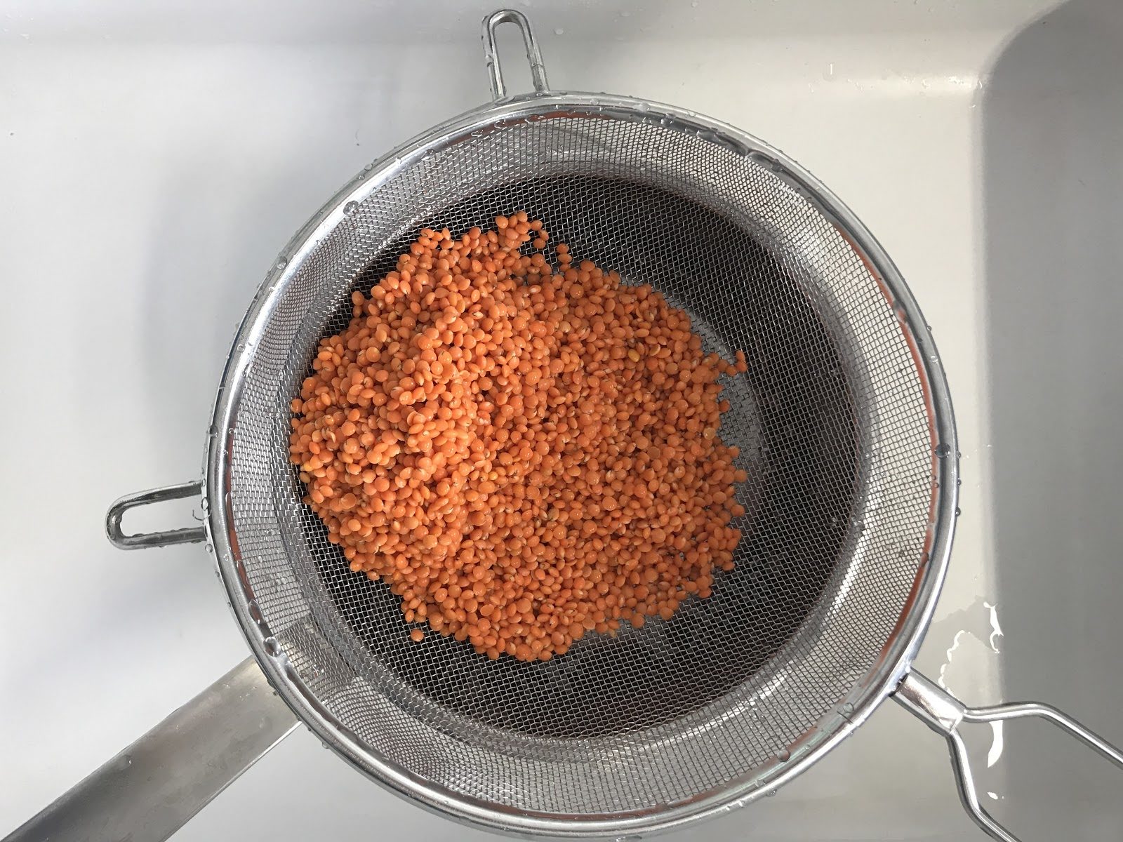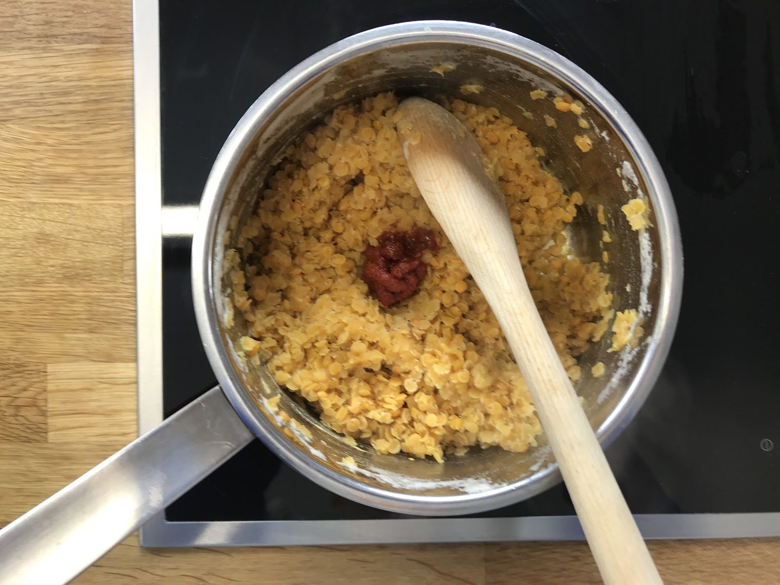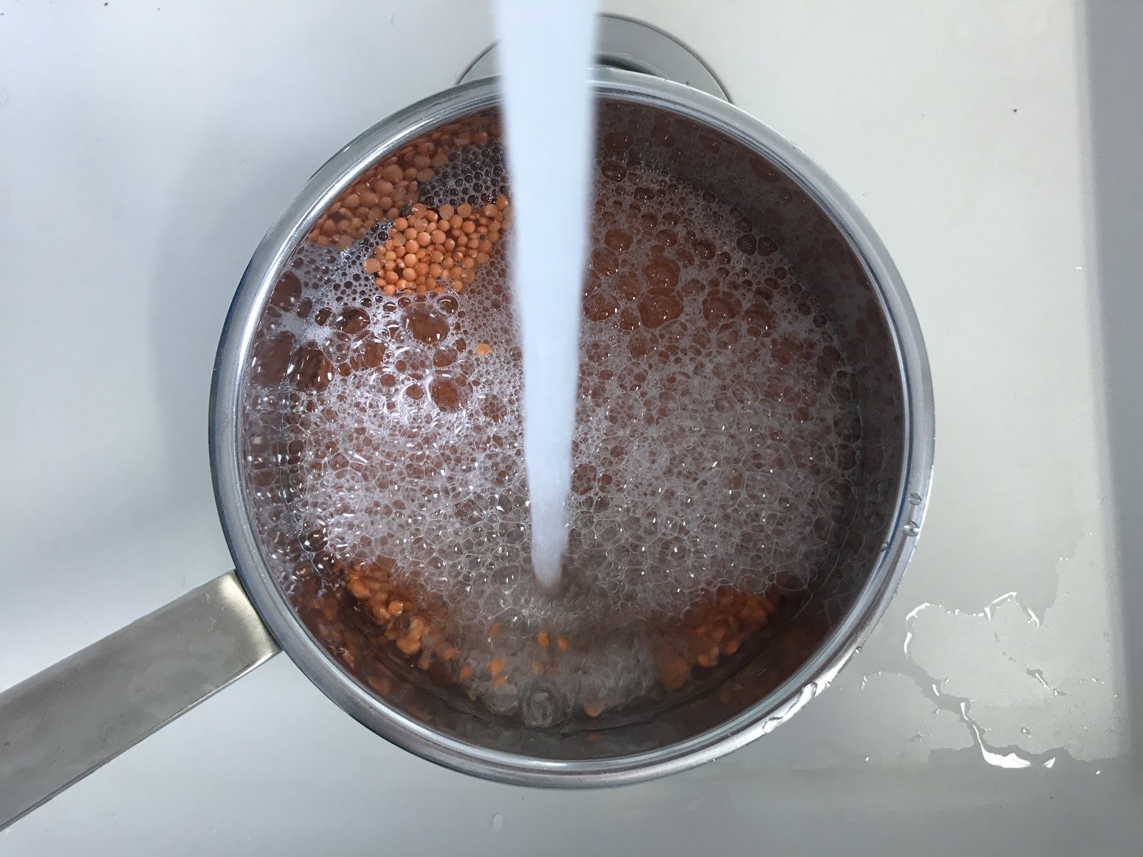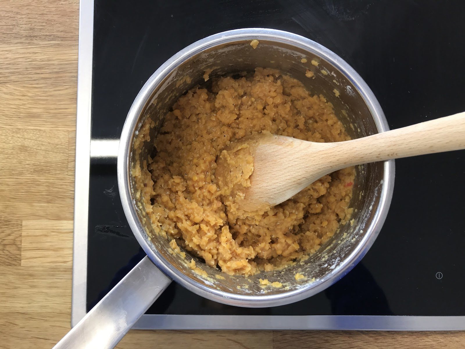 Linsen mit 2,5 Tassen Wasser zum Kochen bringen. Schaum eventuell abschöpfen. Auf kleiner Flamme ca. 20-25 Minuten kochen lassen, bis die Linsen sehr breiig sind: