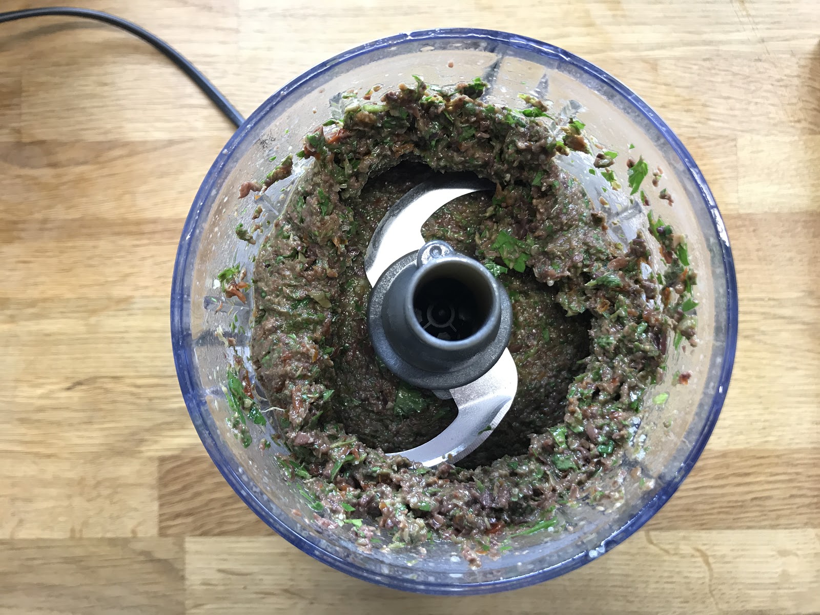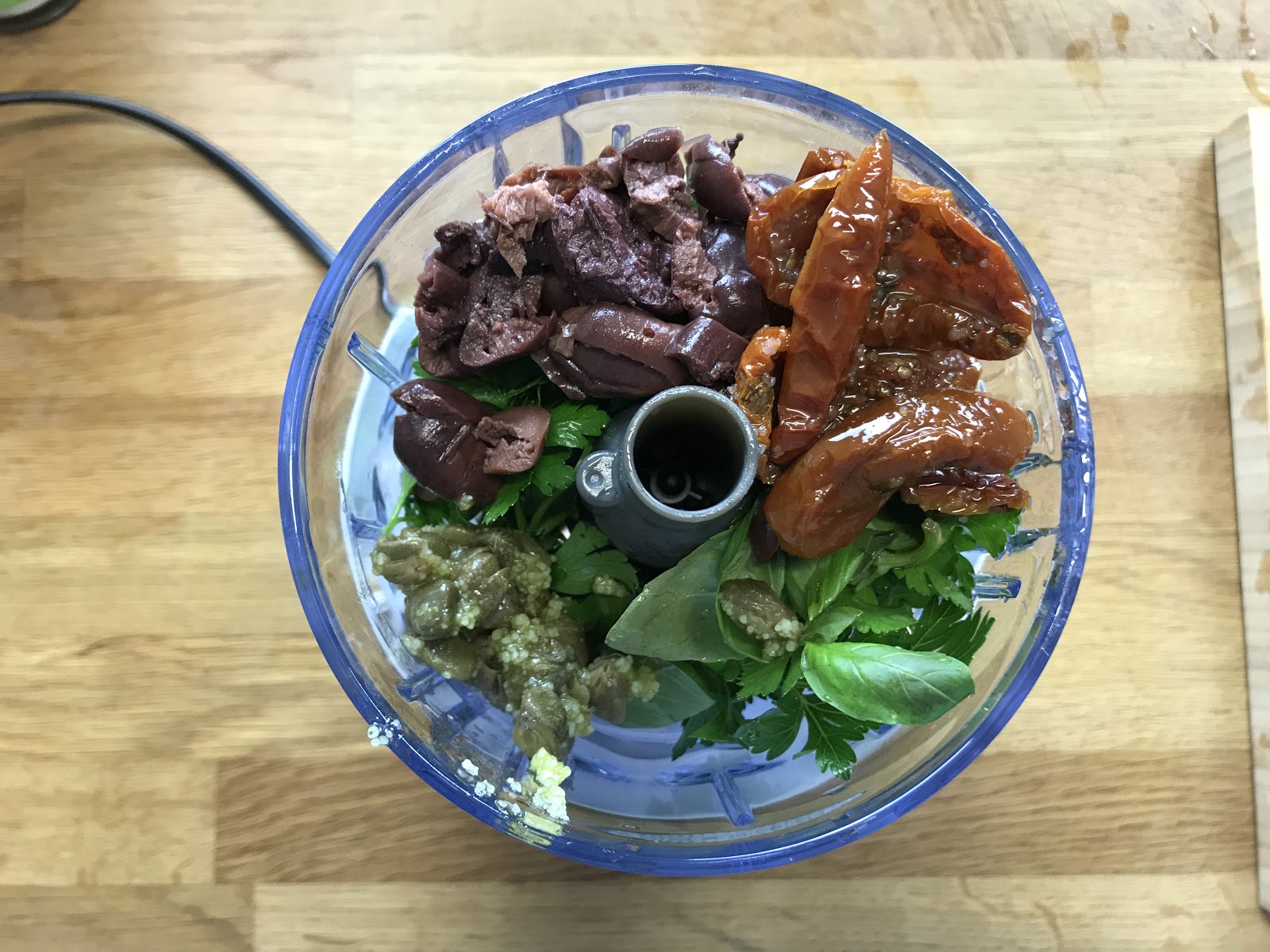 5 getrocknete Tomaten abtropfen und zusammen mit 3 EL Oliven (entkernt), 3 EL Kapern, Basilikum und Petersilie in der Küchenmaschine fein hacken: