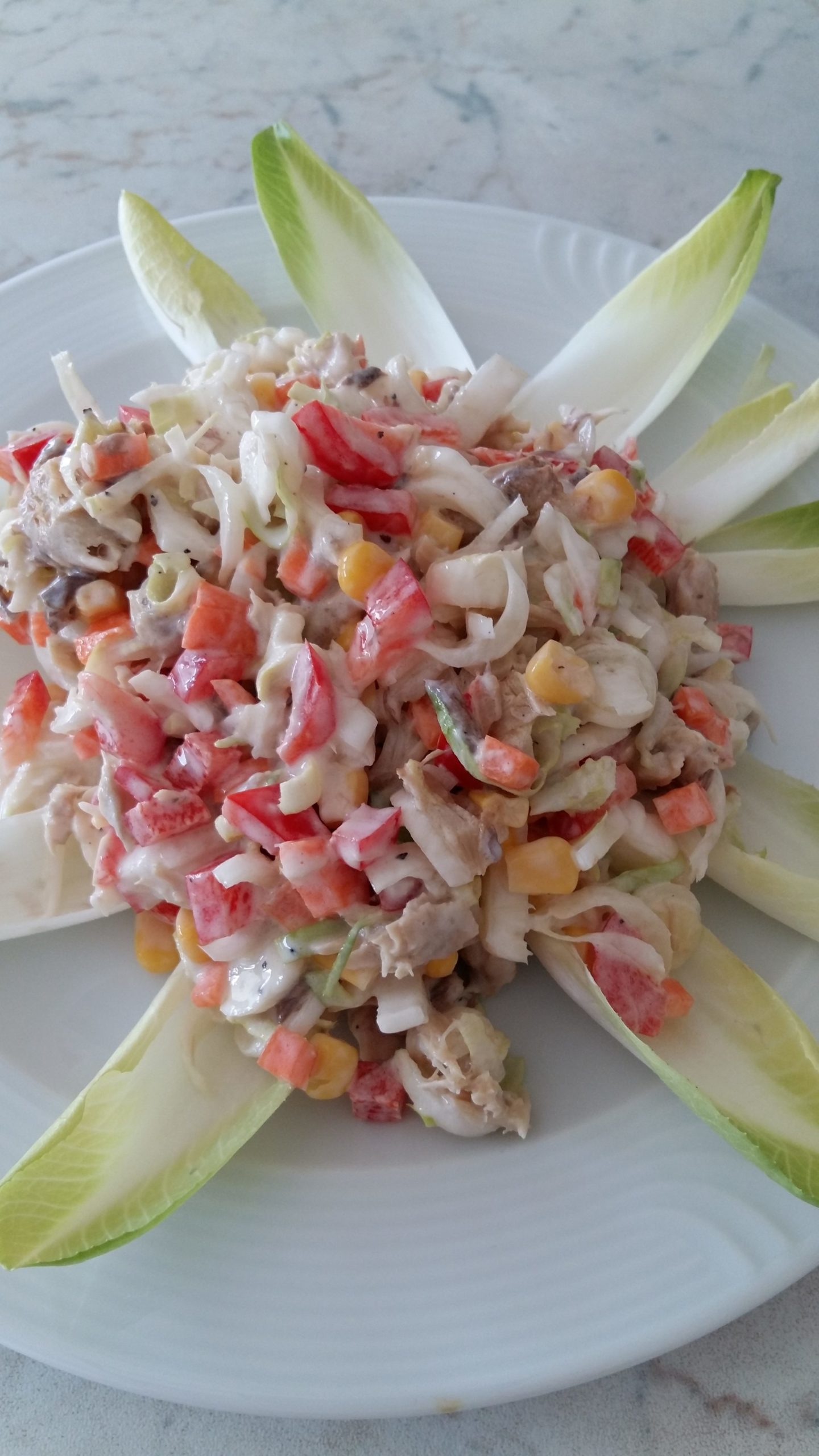 - ¾ der Chicorees quer in feine Streifen schneiden und mit dem Paprika und den Karotten unter das Joghurt rühren. Den abgetropften Mais und die Makrele unterrühren. Mit Salz, Pfeffer und evtl. Zitronensaft abschmecken.