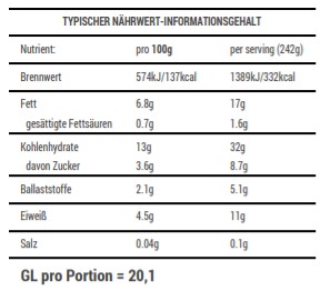 Nährwert: Eiweiß 10-14g, GL 16-21