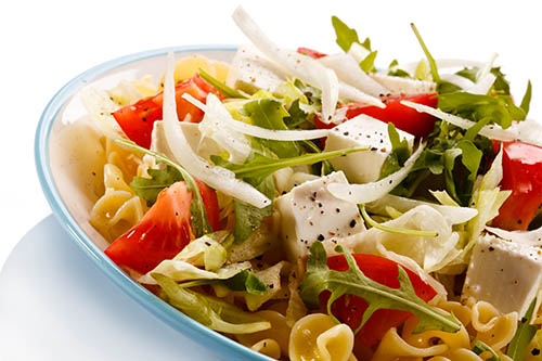 • Die Nudeln auf zwei Teller verteilen und je die Hälfte der Gemüse und des Käses darauf verteilen.