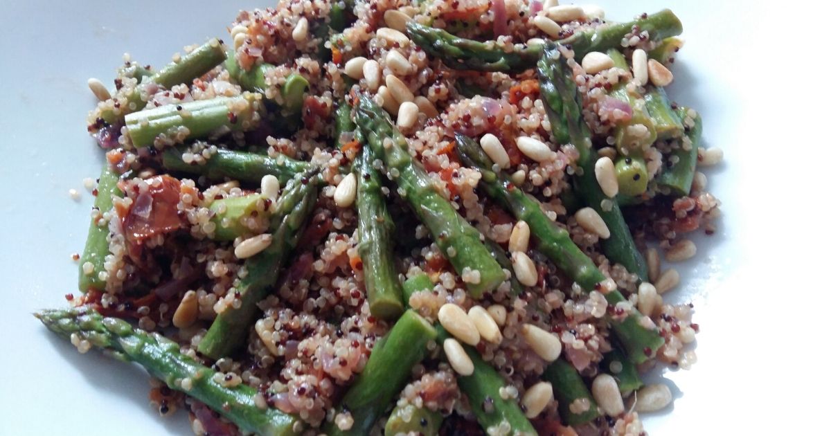 - Den Spargel waschen (nicht schälen!), die unteren Enden abbrechen und den Rest in ca. 5 cm große Stücke schneiden. Die letzten 5 Minuten auf den Quinoa legen (mit einem Deckel verschließen).